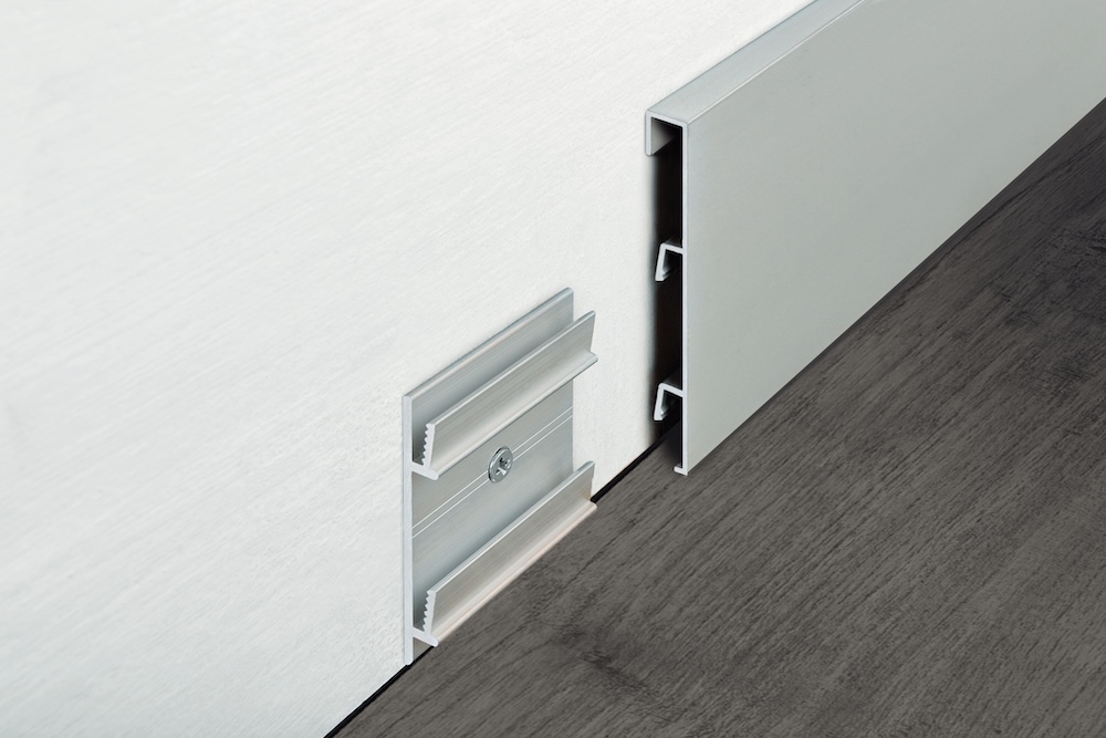 Plinta simpla si eleganta fabricata din aluminiu, compatibila cu toate tipurile de finisaj pentru pardoseli (ceramica, parchet, mocheta, pvc, epoxy), reprezinta o solutie eleganta de finisare si protectie a imbinarii dintre pardoseala si perete, precum si de mascare a rostului de dilatatie dintre pardoseala si perete.